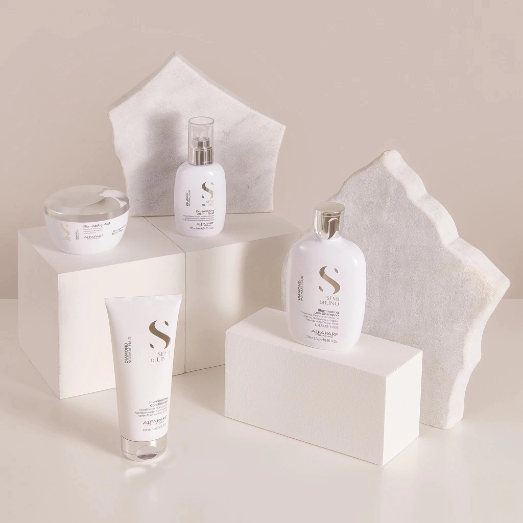 Revitaliza, protege y aporta luminosidad. El cabello mantiene la luminosidad de un diamante para un efecto duradero y espectacular gracias al tratamiento capilar Diamond de la línea Semi di Lino.