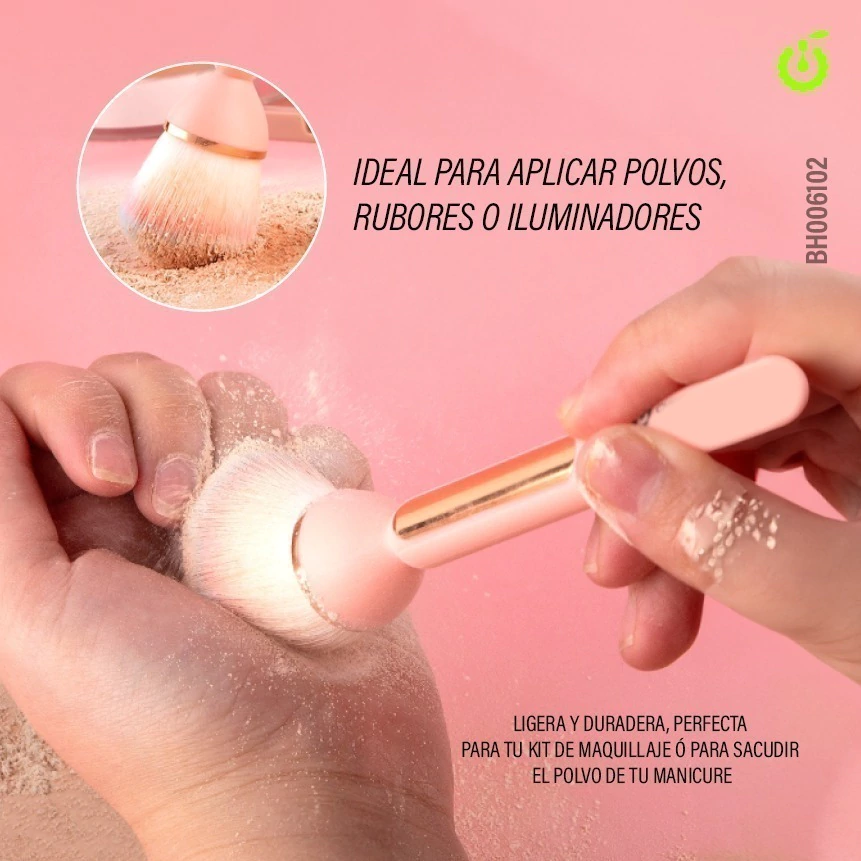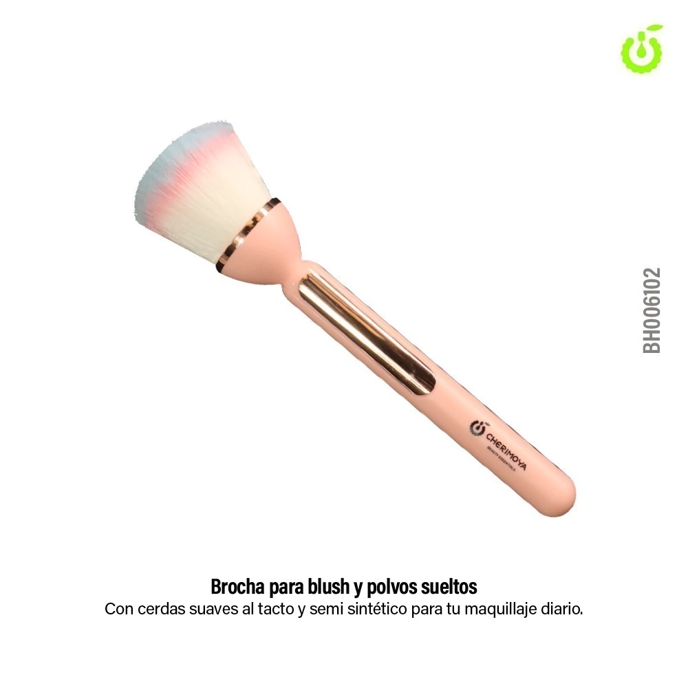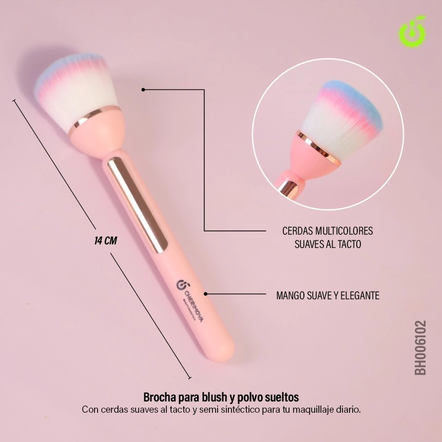 Brocha para Blush y Polvos sueltos. Con cerdas suaves al tacto y semi sintético para tu maquillaje diario.