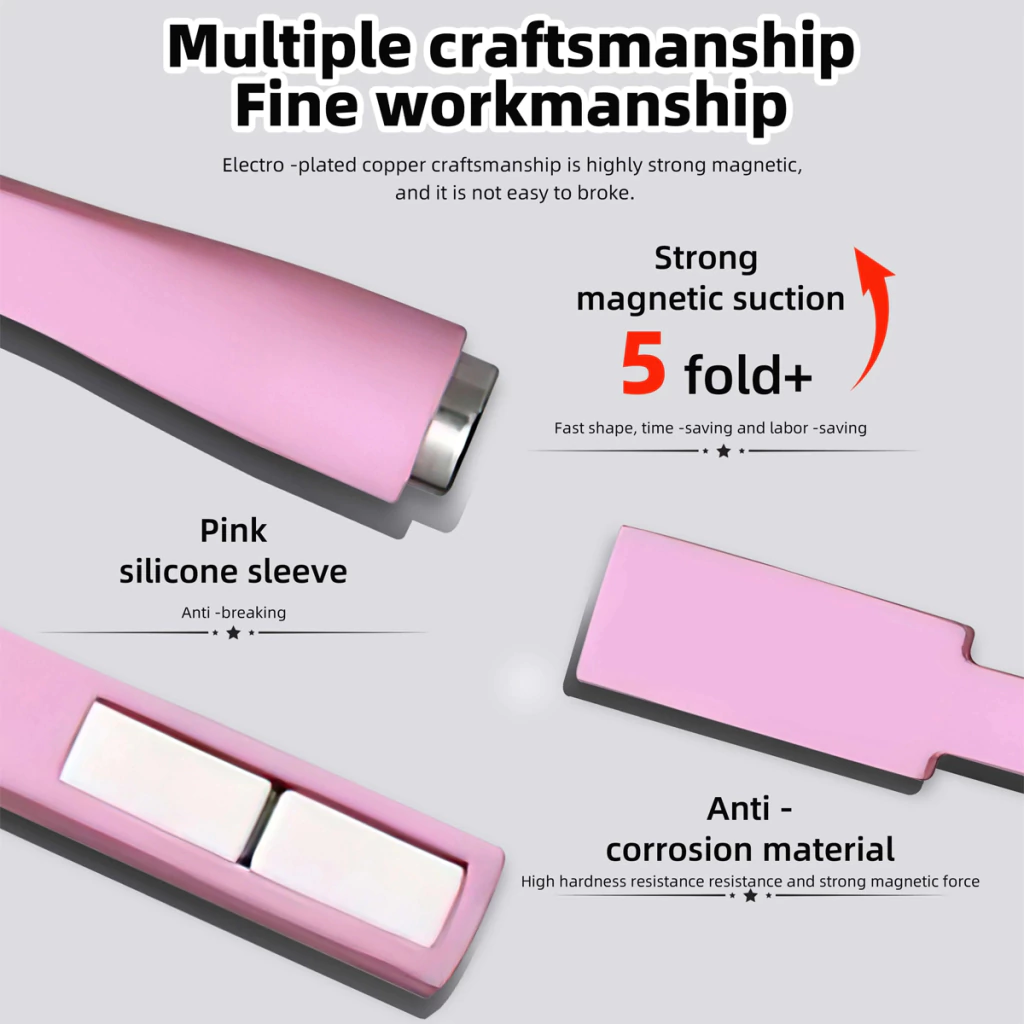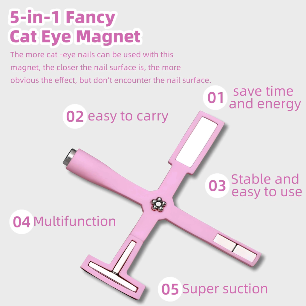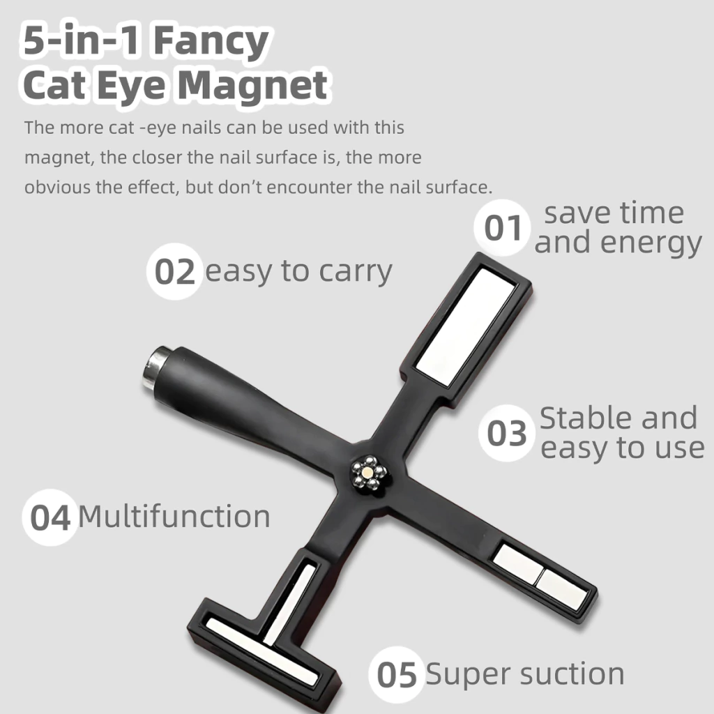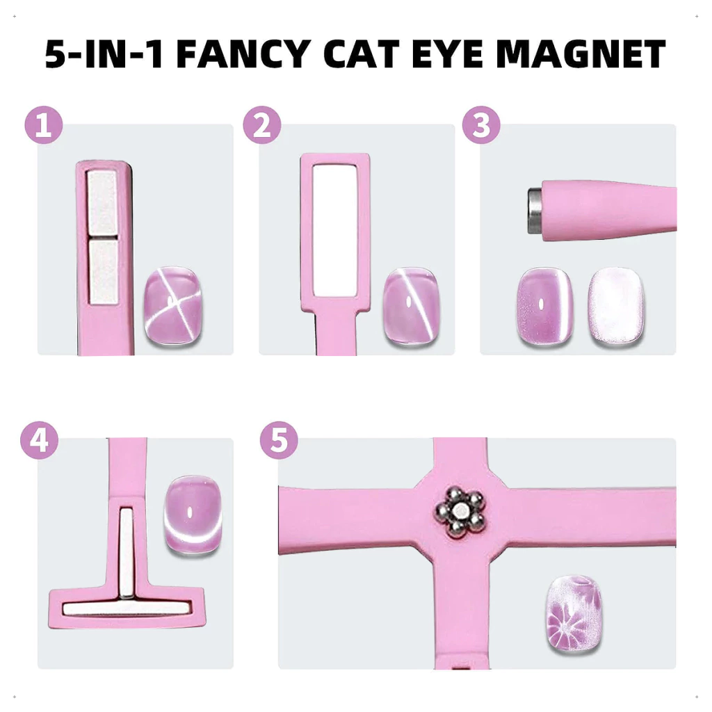 Ideal para realizar diseños decorativos, con productos que contienen pigmentos magnéticos que se activan al contacto con un imán que, al pasarlo de forma vertical o diagonal sobre la uña, provoca el toque deseado.