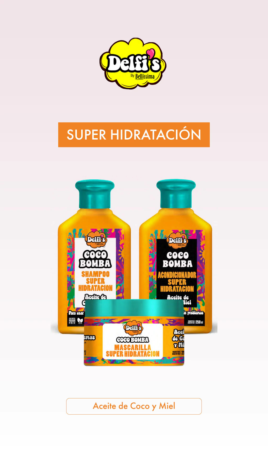 Después de lavar con shampoo, aplica una cantidad generosa de mascarilla DELFI'S COCO BOMBA sobre todo el cabello. Déjalo que penetre de 3 a 5 minutos, enjuaga y estarás lista para peinarte.