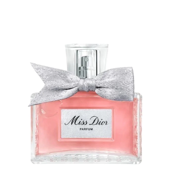 El perfume del Couturier, Miss Dior Parfum se adorna con un lazo "poignard" tejido a partir de hilos de lúrex, en un color plateado que evoca el de su nueva etiqueta. El frasco con tonalidades rosas iridiscentes está envuelto por un motivo pata de gallo, emblemático de Miss Dior.