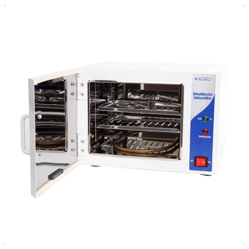 Sus dos amplias bandejas perforadas de acero inoxidable permiten acomodar gran cantidad de instrumental, no oxida a los mismos ni afecta puntas ni filos.