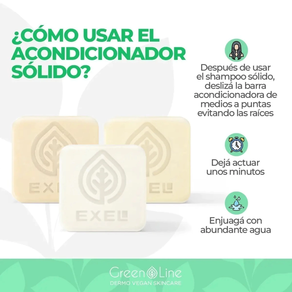 Al finalizar el lavado con Shampoo, deslizar la barra a lo largo del cabello hasta las puntas evitando las raíces. Dejar actuar unos minutos y luego enjuagar con abundante agua.