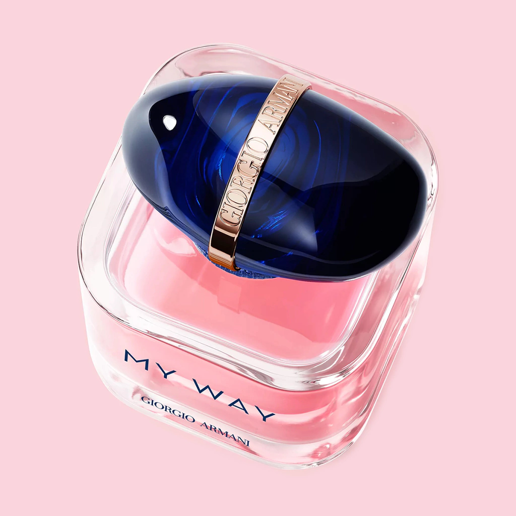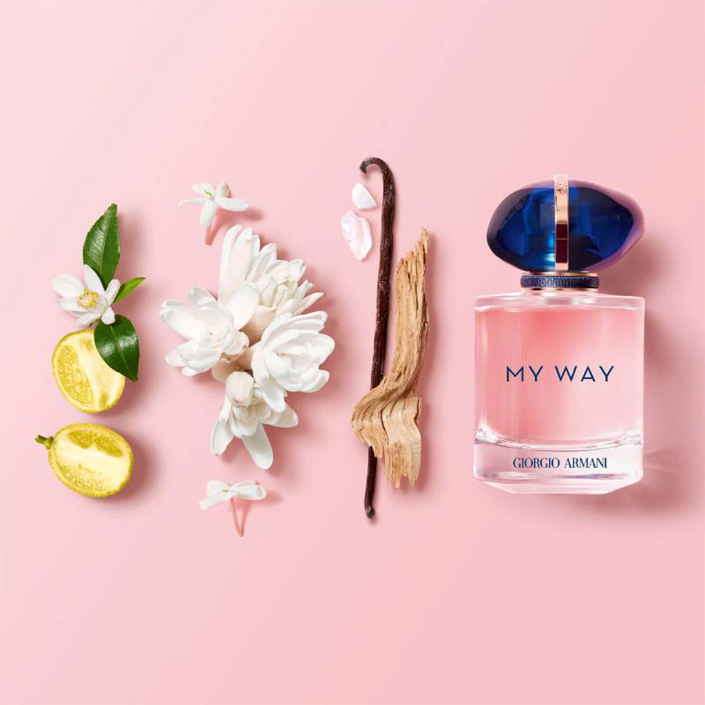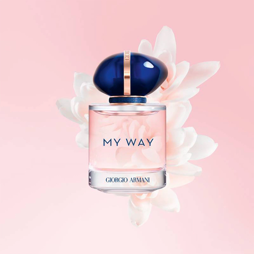 My Way, el perfume floral de mujer de Giorgio Armani que simboliza los encuentros olfativos alrededor del mundo: La bergamota de Italia se encuentra con la flor de naranjo de Egipto en una salida brillante y luminosa. En el corazón, la tuberosa se encuentra con el jazmín, ambos de la India, para firmar este radiante bouquet de flores blancas que aporta generosidad y armonía. El encuentro final de madera de cedro de Virginia con la cálida vainilla de Madagascar y almizcles blancos otorgan el perfecto fondo envolvente. Un perfume de flores amaderado creado con ingredientes de distintas partes del mundo y de manera solidaria. El frasco encapsula el conjunto de experiencias que te hacen ser como eres; es el talismán que siempre te acompaña y captura los recuerdos vividos. El tapón azul es una metáfora del mundo que nos une a todos; abrazado por un anillo dorado con la firma de Giorgio Armani, que no solo le confiere ese aspecto de joya a nuestro talismán, sino que simboliza el camino que cada mujer va tomando en su vida.