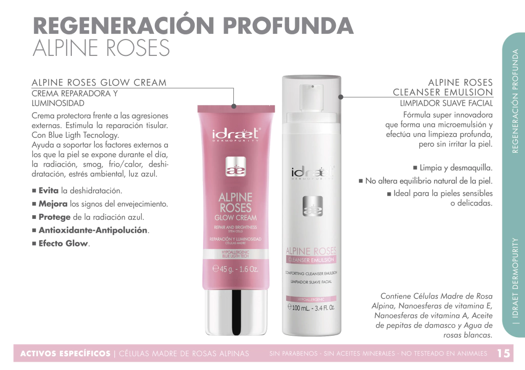 Celulas Madre de Rosa Alpina: Se extraen de una rosa que nace únicamente en los Alpes Suizos a 3000 metros de altura. Protegen a la piel de todas las inclemencias externas, ayudan a proteger las células basales y estimula la mitosis. Actúa estimulando la regeneración y reparación tisular. Produce aumento de la síntesis de cológeno, elastina y glicosamino y glicanos.