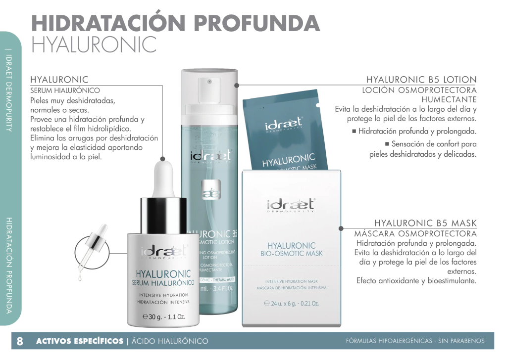 • Ácido Hialurónico de bajo peso molecular: Por su pequeño tamaño penetra a travez de la epidermis y la dermis. Produce un efecto de relleno de arrugas e imperfecciones de la piel. También estimula la proliferación de fibroblastos en la dermis por lo que produce un efecto redensificador. Es Antioxidante, hidratante y fotoprotector. Mejora la función de barrera evitando la pérdida de agua.