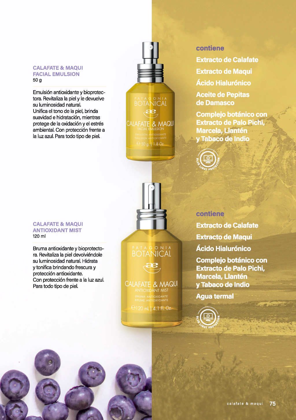 Deja que los extractos de la Patagonia inunden tus sentidos y tu piel. Bruma antioxidante con extracto de Calafate y Maqui extraídos de la naturaleza patagónica, potenciada con ácido hialurónico de extrema pureza y extractos vegetales que protegen la piel. Hidrata y tonifica brindando frescura y protección antioxidante. Con protección frente a la luz azul. Gran sensación de confort en la piel.
