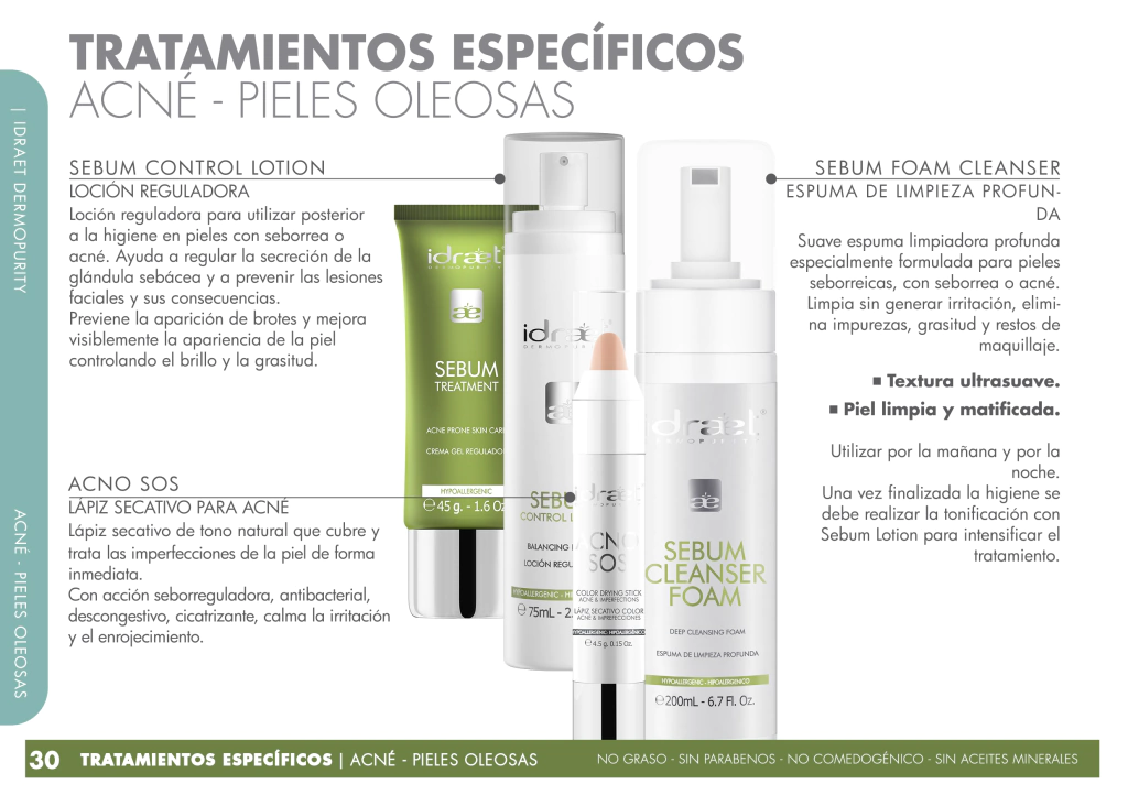 • Zn sebum: Contiene peptidos de Zinc con acción seborreguladora, antibacterial y antiinflamatorio. También contiene complejo vegetal con Hamamelis (astringente, antibacteriano, calmante), canela (antibacteriano, antioxidante), malva (Refrescante, descongestivo, calmante) y tomillo (cicatrizante, antiséptico).