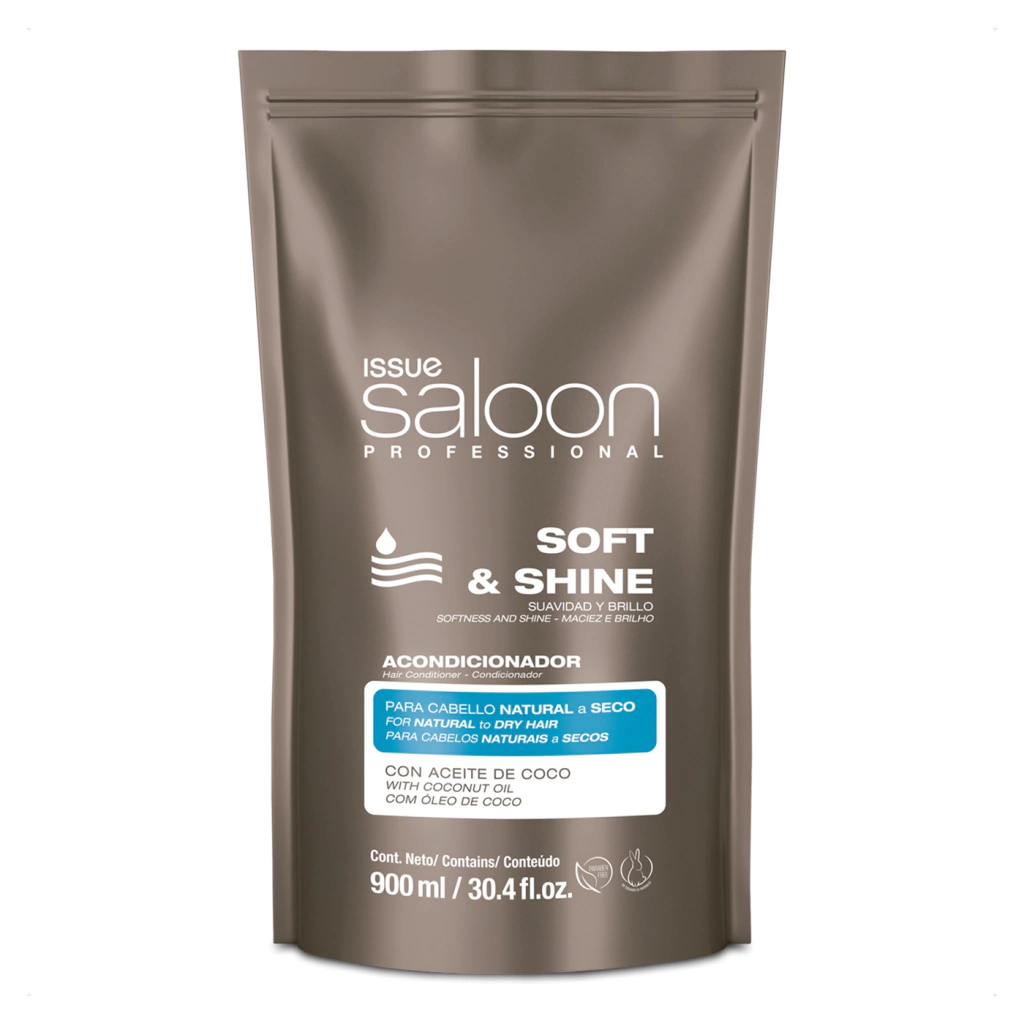 El acondicionador Soft & Shine Issue Professional provee un acondicionamiento eficaz, con efecto ligero y sin residuos oleosos. Su fórmulo contiene Aceite de Coco para una óptima hidratación y brillo. Es ideal para cabello natural a seco.