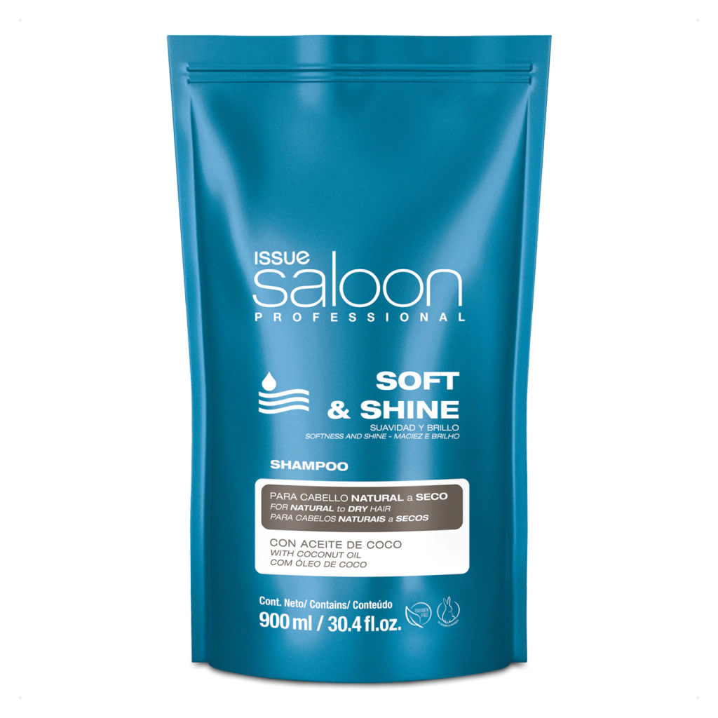 El shampoo Soft & Shine Issue Saloon Professional limpia la fibra capilar brindando hidratación, brillo y suavidad. Su fórmula innovadora con aceite de coco y pH balanceado es ideal para el cabellos natural a seco, con excelente desempeño en cabellos naturales a tratados.