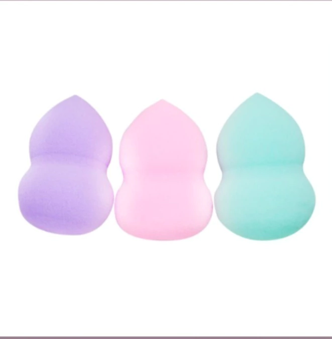 Esponja Jessamy con forma ergonómica que resalta la definición del maquillaje, en tres colores: rosa, morado y aguamarina.