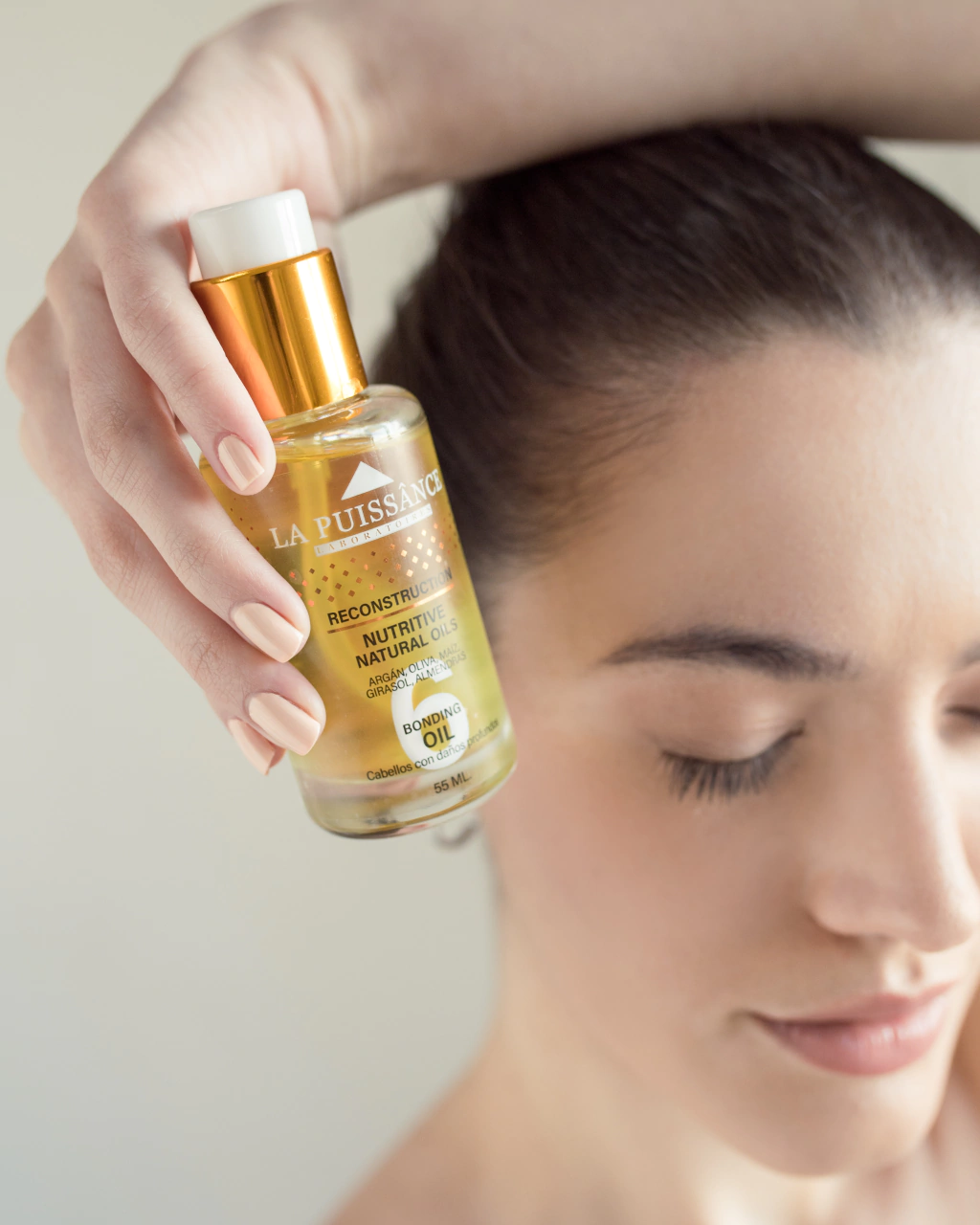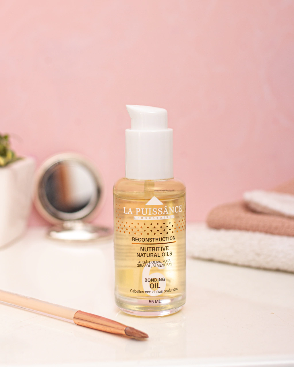 Paso 6 “bonding oil”: es un serum termo activo que se aplica de medios a puntas, para nutrir, hidratar y definir peinados. Es de uso cotidiano y lo podemos aplicar en cualquier momento del día, no deja restos de oleos.