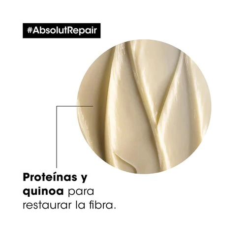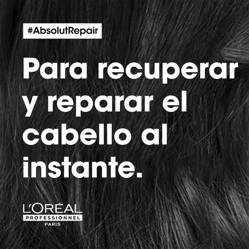 La máscara Absolut Repair ofrece la última experiencia de la reparación profunda profesional para el cabello dañado y seco. Los resultados se demuestran: recupera visiblemente el cabello dañado que resulta en 77% *menos daños en la superficie de la fibra. El pelo es manejable y más brillante después de la rutina de tratamiento, incluyendo el shampoo Absolut Repair. La fibra se fortalece y es restaurada gracias a los potentes ingredientes de quinua y proteínas. Esta máscara de lujo tiene una textura sedosa, que envuelve el cabello dañado con cuidado sin dejar ningún residuo. Para un resultado óptimo de reparación contra el daño, utilizar toda la rutina Absolut Repair. * Shampoo + Máscara Absolut Repair.
