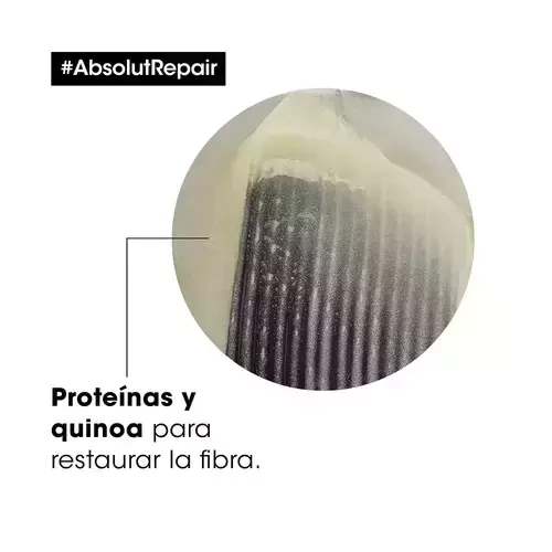El shampoo Absolut Repair ofrece la última experiencia profesional de reparación para el cabello dañado. Los resultados se demuestran: El shampoo recupera visiblemente el cabello dañado con un toque muy ligero y suave que resulta en 77% * menos daños en la superficie de la fibra. El pelo es mangeable y más brillante después de la rutina de tratamiento incluyendo la máscara Absolut Repair. La fibra se fortalece y restaura gracias a los potentes ingredientes de quinoa dorada y proteínas. Esta fórmula profesional es utilizada y aprobada por peluqueros y parte de su tratamiento en los salones de Loreal Paris Professionnel en todo el mundo. Para un resultado óptimo de reparación de daños en el cabello, aplicar la rutina de Absolut Repair de cuidado del cabello de trespasos, que incluye el shampoo nutritivo, la máscara de reparación profunda y el spray 10-en-1 multipropósito.