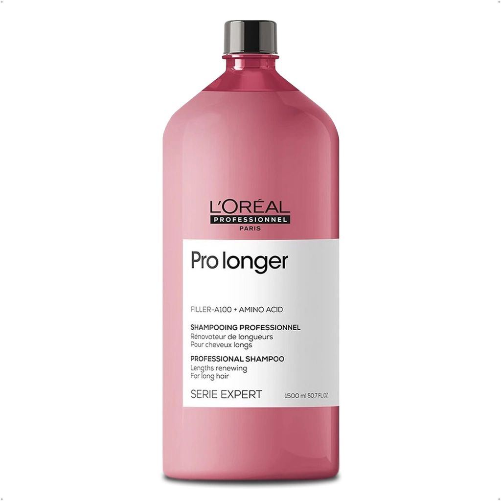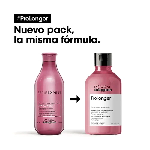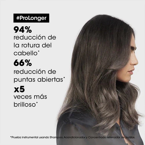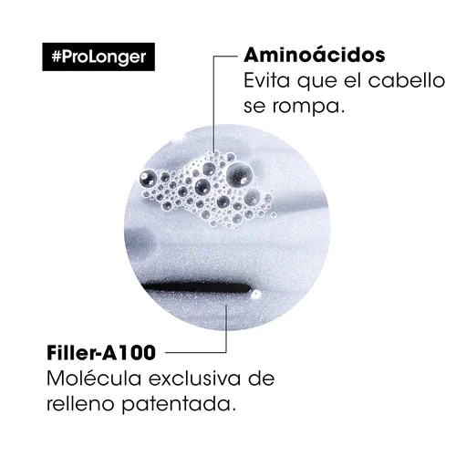 El shampoo Pro Longer ayuda a engrosar el pelo largo, mientras que lo vuelve visiblemente más sano y más fuerte. Cuando se utiliza con el acondicionador Pro Longer, hay un 44% de reducción de extremos y división de la rotura del cabello en un 20% *. El relleno a-100 utilizala tecnología patentada por Loreal Professionnel, para rellenar y engrosar el cabello desde el interior. La fórmula funciona en los extremos delgados, o áreas donde más se necesita ayuda.