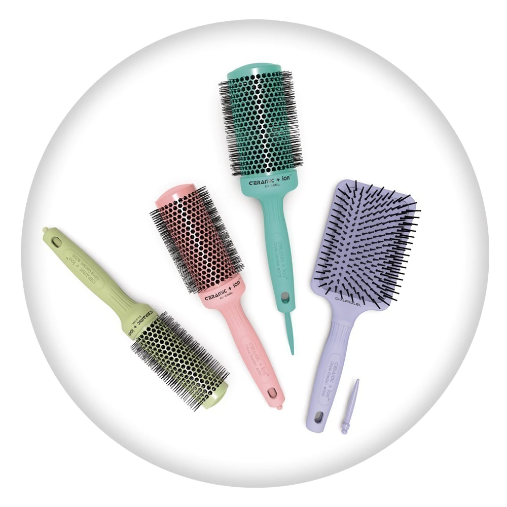 Cilindro recubierto de cerámica. Tecnología de iones de turmalina. Diseño único patentado. Selección de seccionamiento retráctil. Se calienta más rápido y retiene el calor por más tiempo. Cerdas de punta blanda. Suave para el cabello y el cuero cabelludo. Anti estático. Cuerpo 100% sin costuras. Absolutamente libre de enganches. Agarre ergonómico y cómodo.