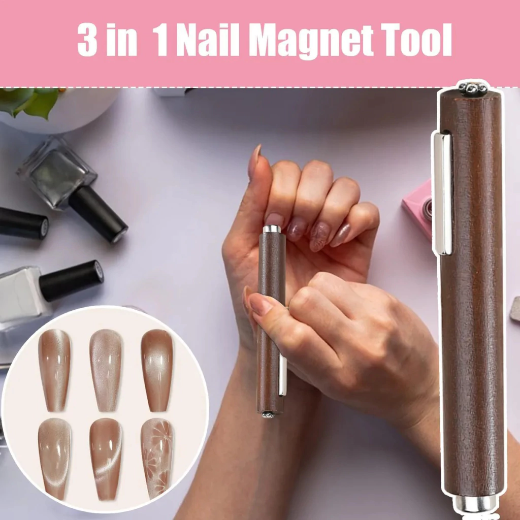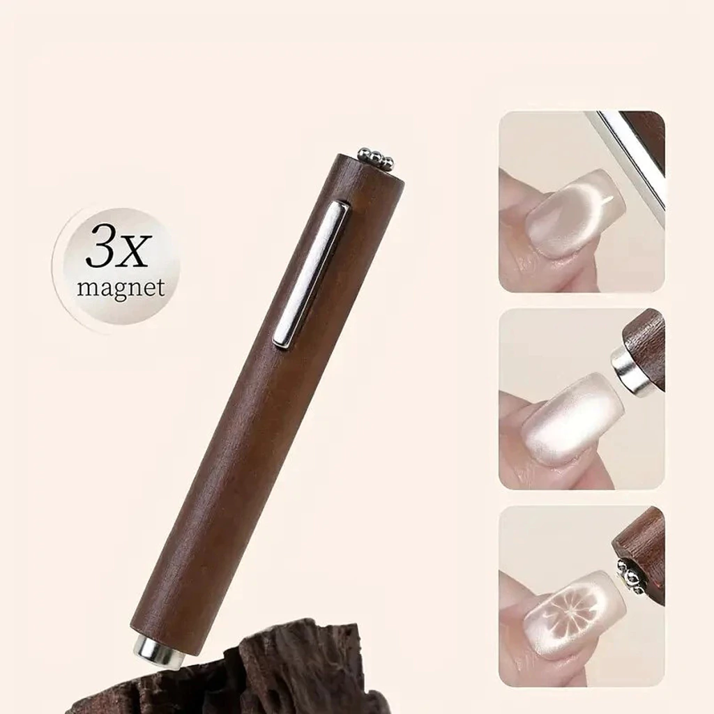 Se usa con esmaltes magnéticos: después de aplicar el esmalte, acercás el imán a la uña (sin tocarla) y el polvo metálico del esmalte se mueve, creando un efecto luminoso o tridimensional.