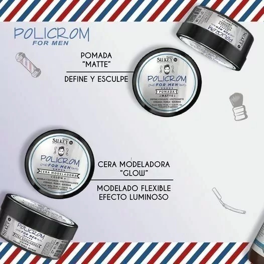 » Modo de Uso: Tomar una pequeña porción de Pomada “Matte” Policrom For Men, esparcirla en las manos y distribuirla de manera homogénea sobre el cabello seco. Modelar hasta obtener el efecto deseado.