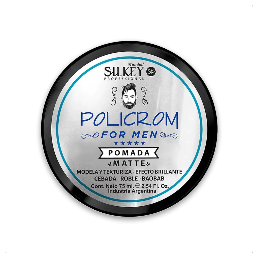 • 1 Policrom Pomada Matte (75ml): Define y esculpe. Efecto Matte. La Pomada “Matte”, permite lograr estilos esculpidos y bien definidos con efecto matte. Puede ser aplicada sobre el cabello seco.
